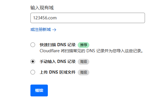 1.1、点击“添加域”进入下一个页面,输入你的域名接着选择“手动输入 DNS 记录”然后点击继续,接着是选择套餐、我们选择左侧的免费套餐即可,选择了套餐后拉到页面的底部点击“继续前往激活”按钮,点击确定后停留在该页面即可。