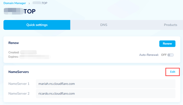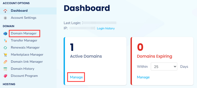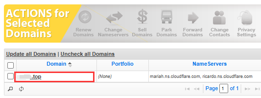 1.2、登录NameSilo后点击My Account,进入页面后点击Domain Manager或者Active Domains下面的“Manage”按钮,进入页面后再点击你的域名,然后将原本的NameServers(名称服务器)修改成Cloudflare提供的即可。