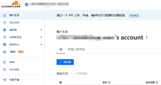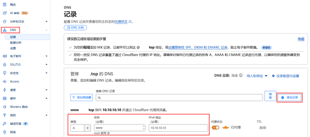 回到Cloudflare页面,点击左上角的“账户主页”然后再点击我们托管的域名,进入页面后选择左侧的 DNS 按钮,接着点击右侧的“添加记录”按钮。