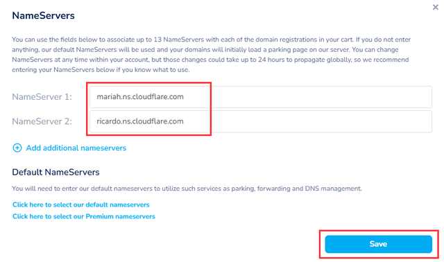 接下来需要修改你域名的“名称服务器(NameServers)”,如果是免费的二级域名请自行托管到Cloudflare,这里以NameSilo的为例: