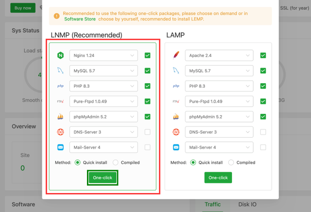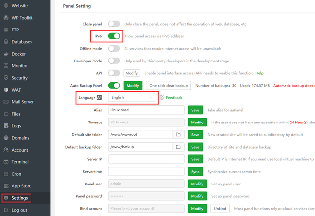 通过之前在SSH客户端安装aapanel完成后提供的链接和账号、密码,我将链接复制到浏览器中进行登录,首次登录会让你升级成为付费版本,我们直接关掉即可。然后是弹出需要安装的软件,我们直接选择推荐安装的。如果没有弹出我们也可以手动安装,等到安装完成后我们将aapanel面板设置成中文并开启IPv6。