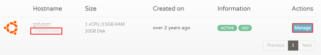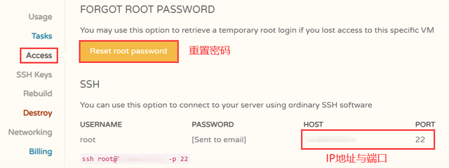 登录后点击栏目上的Cloud,将页面拉到最底部就能看到你购买VPS(服务器),需要记住你的IP地址和VPS密码,购买成功后他们会将这些信息发送到你的邮箱的,如果找不到我们可以重置密码或者重新安装系统,点击Manage进入详细信息,无论是重置密码或者重新安装系统平台都会将新的密码发送到你的邮箱中。
