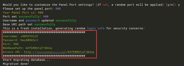 安装完成后会让你选择是否手动设置面板端口,按y手动设置,按n自动设置,设置完成后框选红框内的3X-ui面板信息右键复制保存。