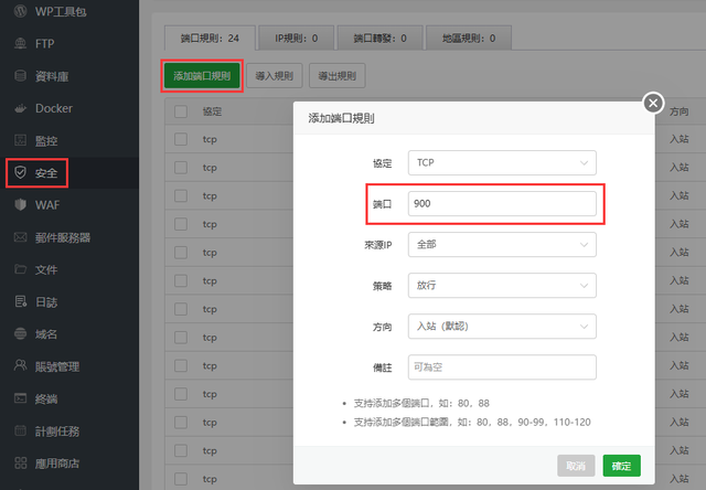 点击左侧的“安全”按钮添加900和800这两个端口。