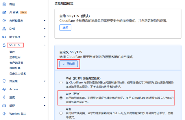 接下来点击左侧的 SSL/TLS,点击配置按钮,点击“自定义 SSL/TLS”下面的选择,我们选择“完全(严格)”然后保存。