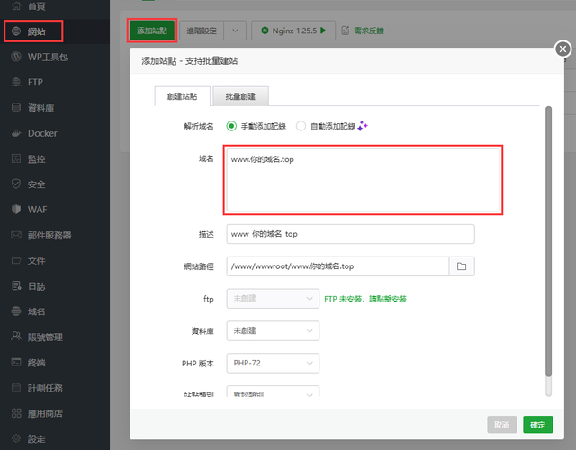 回到aapanel面板点击左侧“网站”点击“添加站点”。
