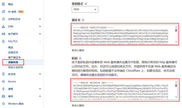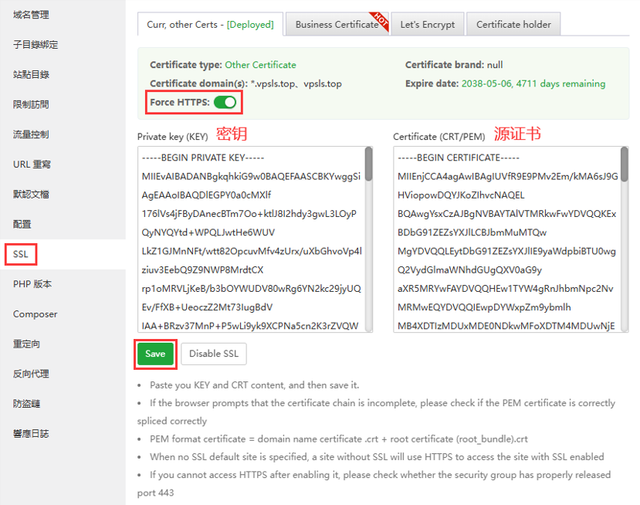 添加网站后点击你添加的站点,点击“SSL”,把在Cloudflare上获取的密钥和源证书粘贴到对应的位置并保存。