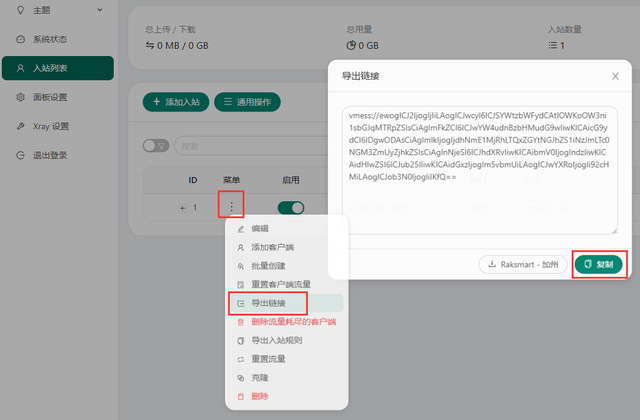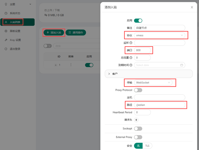 登录3X-ui面板后点击左侧的入站列表点击添加入站对应配置如下: