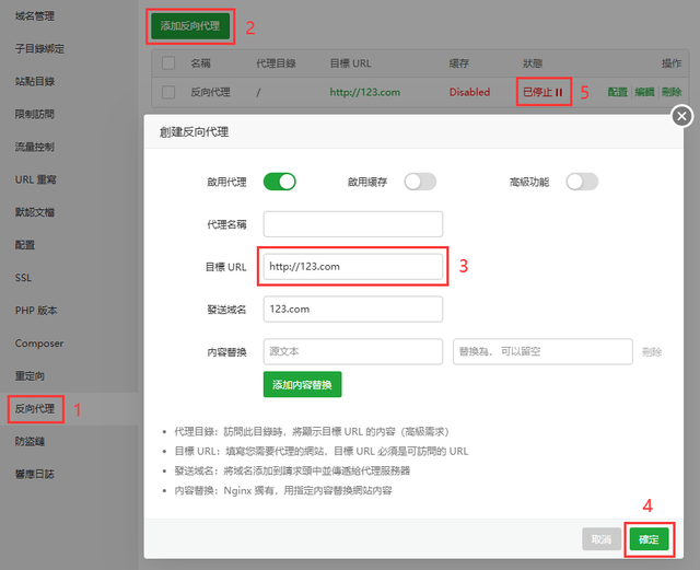 点击反向代理进行设置,添加后把状态更改成已停止。