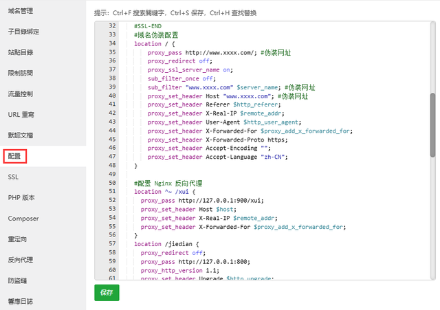 点击配置找到#SSL-END把下面的代码插入到下一行中并保存。