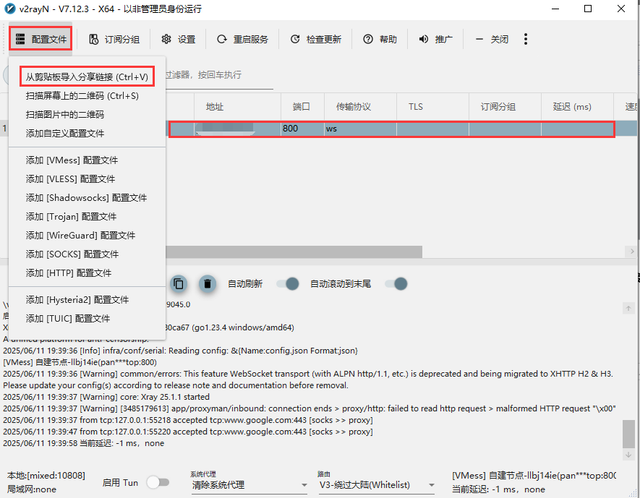 选择7.12.3版本的v2rayn-windows-64-selfcontained.zip进行下载,解压后点击左上角的配置文件选择从剪贴板导入分享链接(Ctrl+V)进行导入刚复制的节点链接,双击导入的节点进行修改: