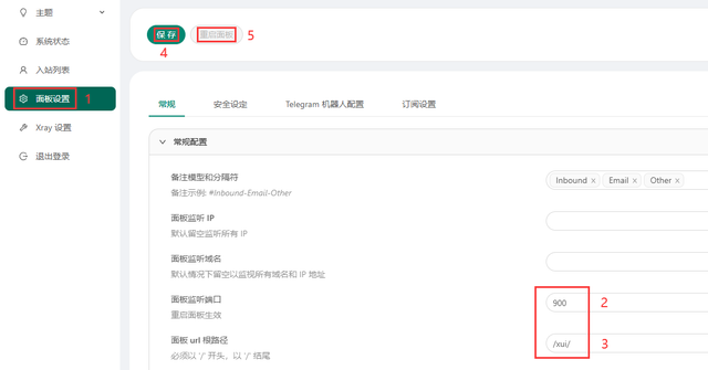 登录后点击面板设置:端口填写900,面板url根路径填写/xui/,保存后重启面板。